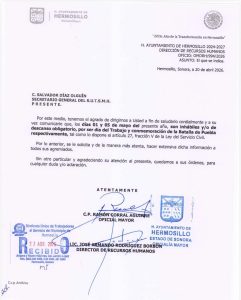 Posted on : abril 23, 2026 By Transparencia SUTSMH AVISOS Aviso de días inhábiles y/o de descanso 01 de mayo 05 de mayo del presente año, por ser día del Trabajo y Conmemoración de la Batalla de Puebla respectivamente. Comité Ejecutivo 2024-2027